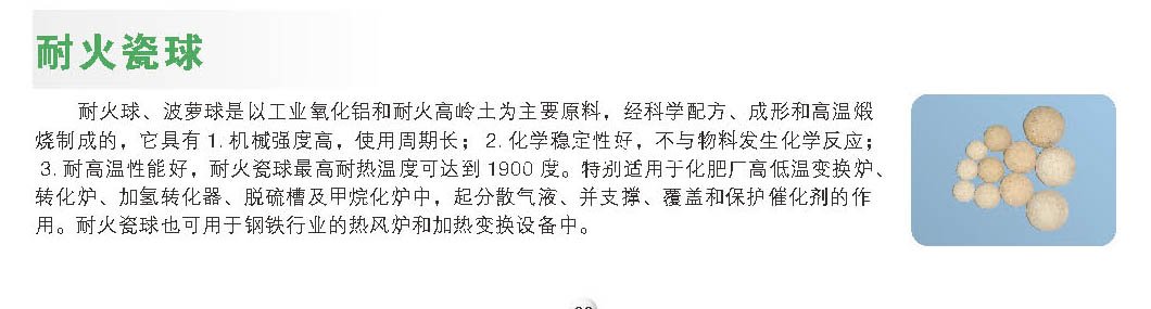 3. 耐高溫性能好,耐火瓷球高耐熱溫度可達到 1900 度。特別適用于化肥廠高低溫變換爐、轉(zhuǎn)化爐、加氫轉(zhuǎn)化器、脫硫槽及甲烷化爐中,起分散氣液、并支撐、覆蓋和保護催化劑的作用。耐火瓷球也可用于鋼鐵行業(yè)的熱風爐和加熱變換設(shè)備中。耐火瓷球分普通耐火球和高鋁耐火球,普通耐火球適用于硫酸和化肥行業(yè)的轉(zhuǎn)化器和變換爐,高鋁耐火球適用于尿素、鋼鐵等行業(yè)的熱風爐、加熱變換爐等設(shè)備。本站還有介紹陶瓷散堆填料